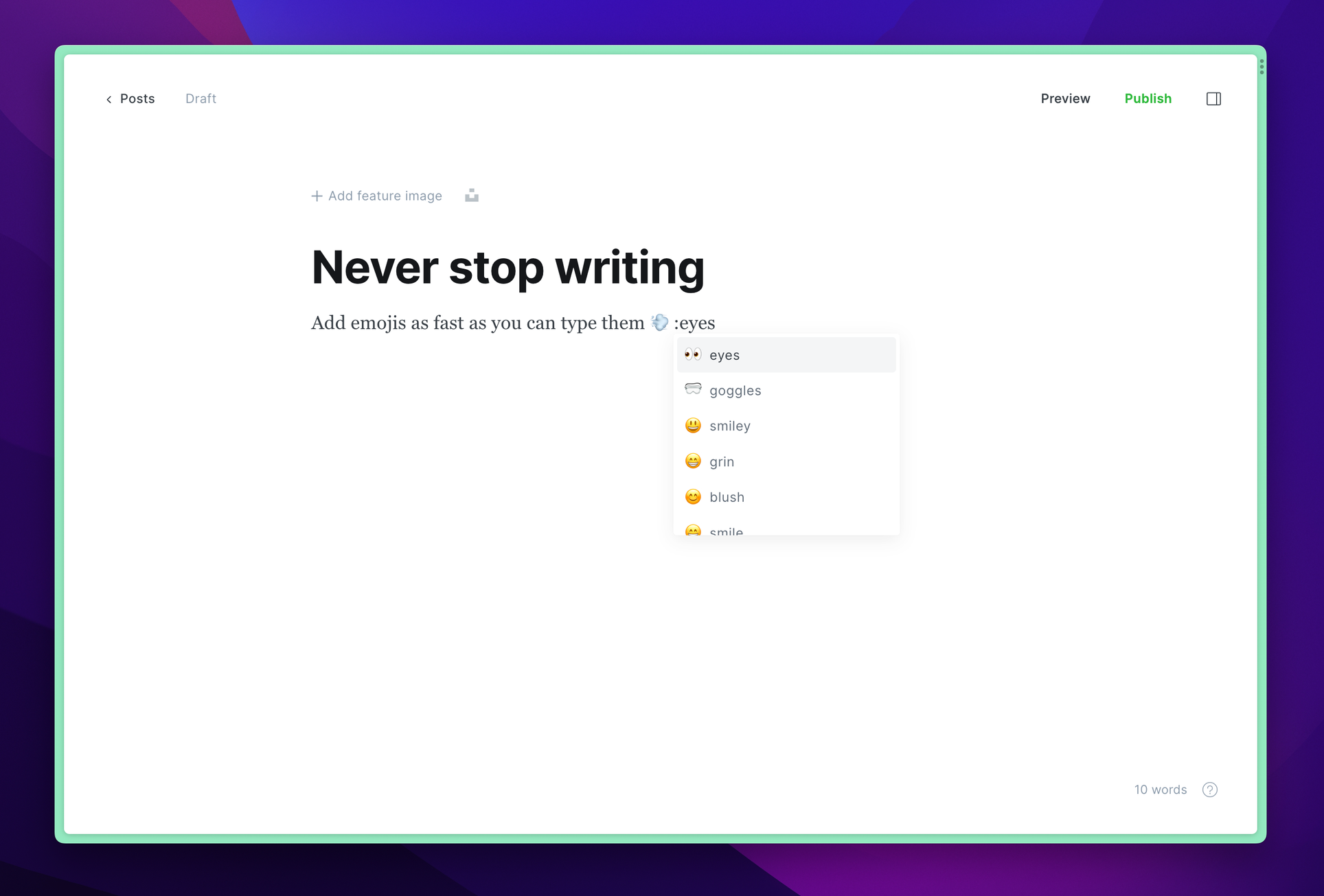 Now, you can add any emoji by simply pressing : and continuing to type. No more fiddling with emoji pickers, and no more interruptions to your creative flow as you write 🥳