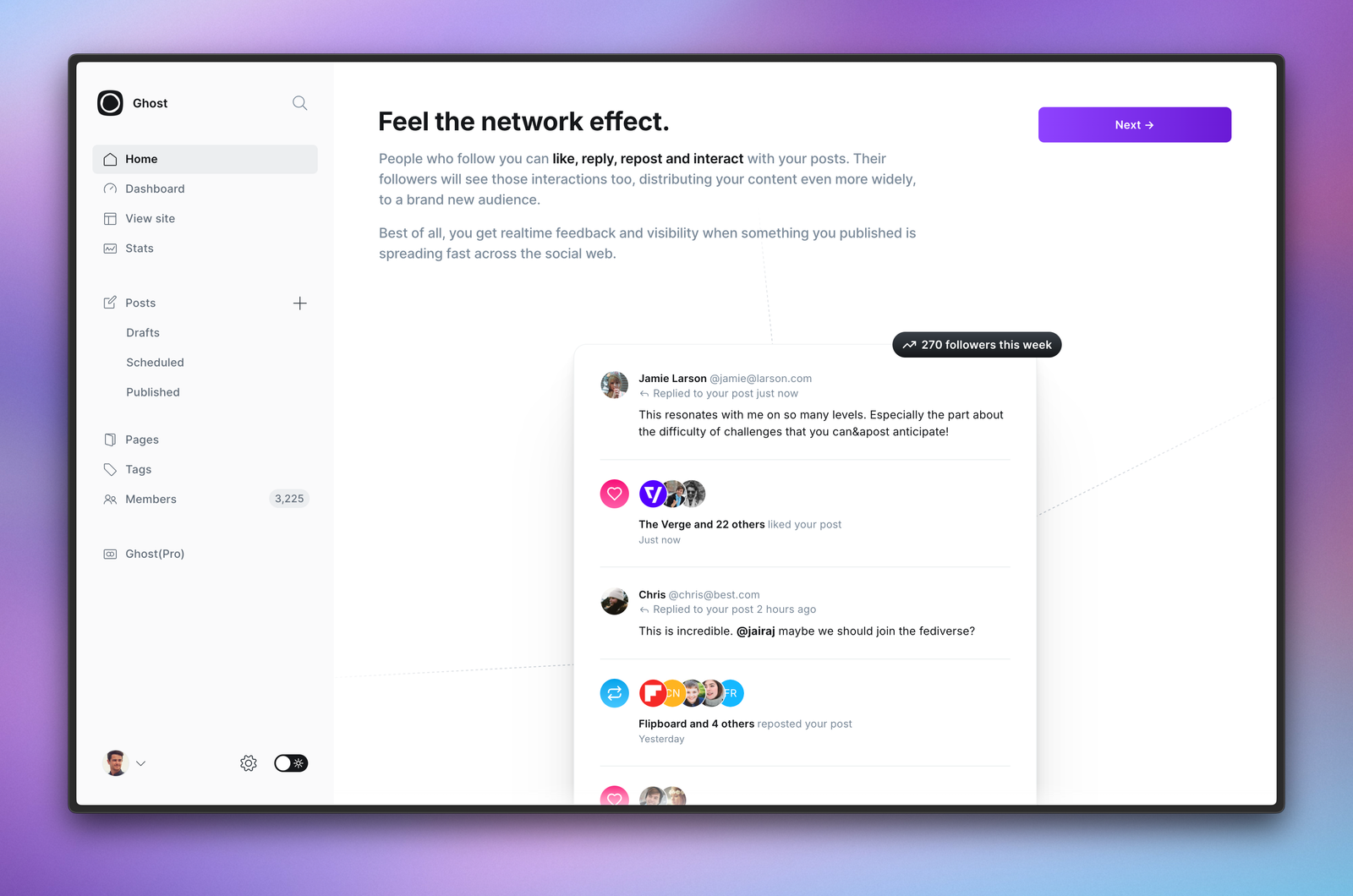 You can find, follow and interact with people and publications across Ghost, WordPress, Threads, Mastodon, BlueSky, Flipboard, Tumblr (soon), and hundreds of other platforms that make up the open network known as The Fediverse.