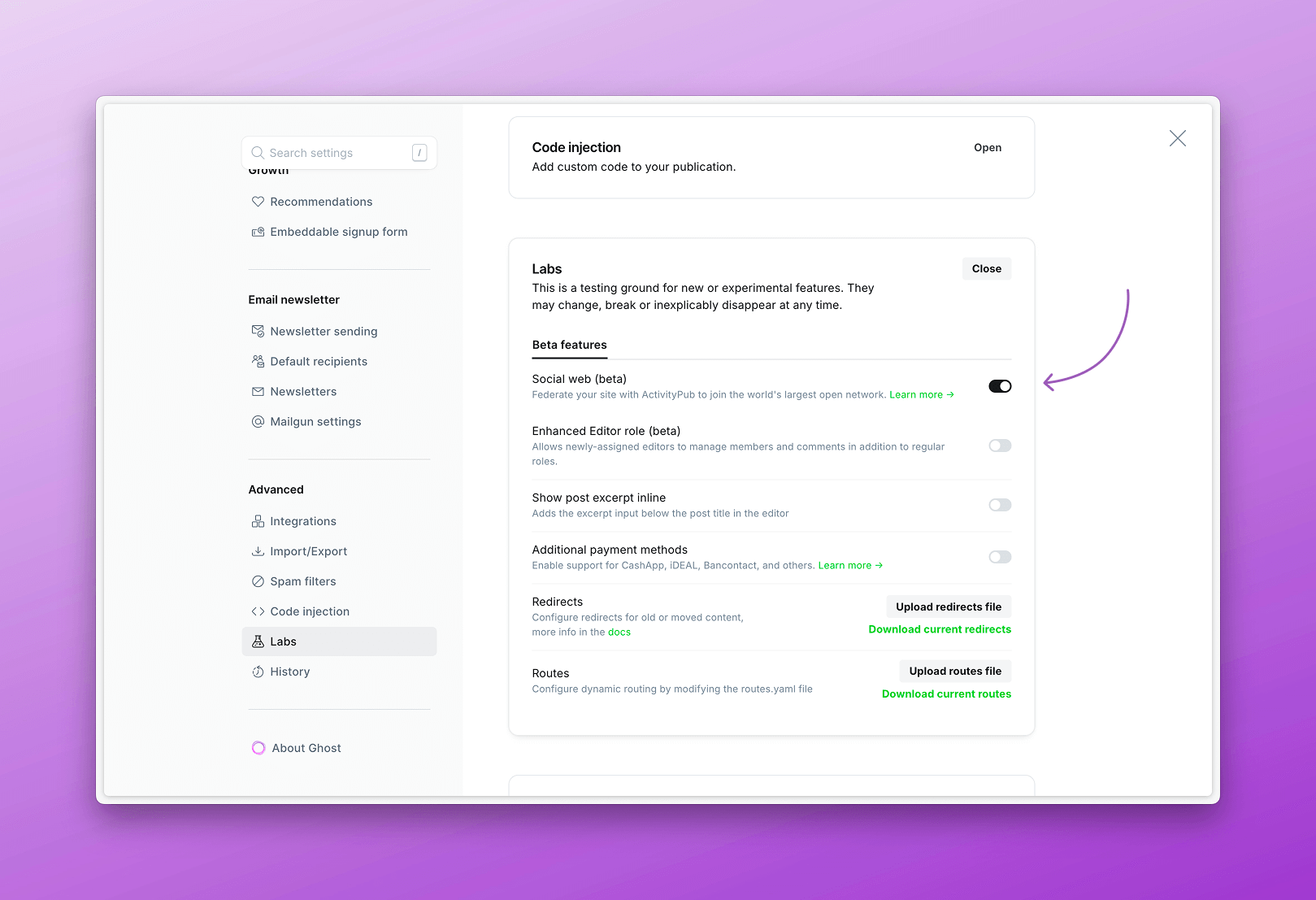 Once you're ready to take things for a test drive, Ghost(Pro) users can open Ghost Admin and head over to Settings → Labs to enable the beta.