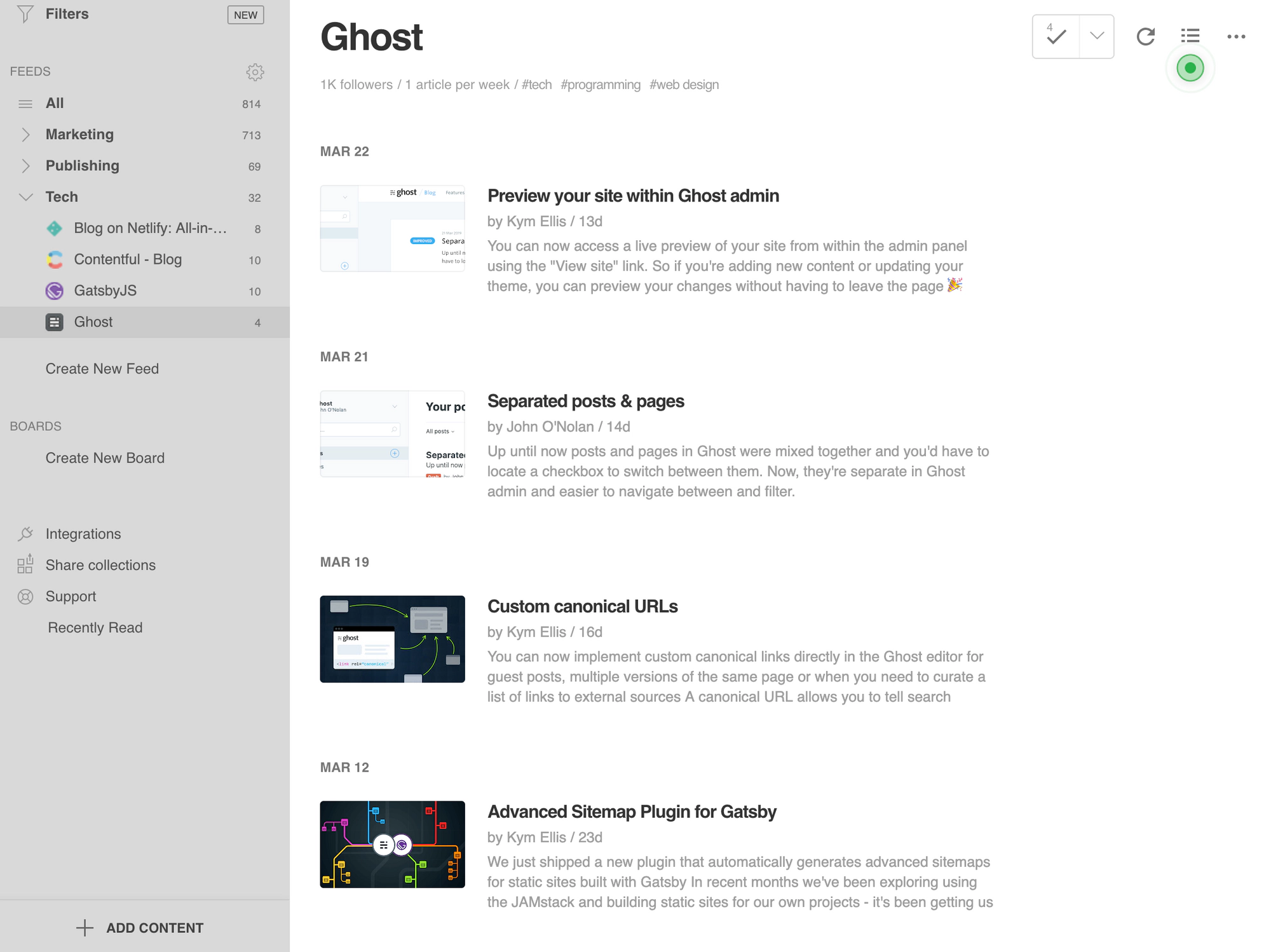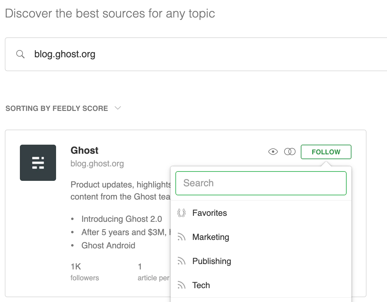 When you discover the Ghost publication you are looking for, use the follow button to add the publication to your Feedly account and pick an appropriate folder.