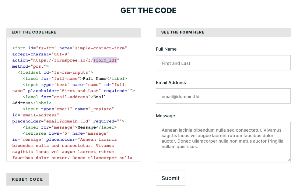 Whether you want to add an email contact form to a page on your Ghost site, collect data from your readers or gather feedback, Formspree has a variety of HTML forms which you can quickly integrate on your site, and have Formspree email you the submissions - no sign up required!