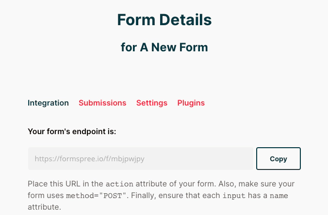Copy the provided endpoint URL. This URL will be used as the value of the action in your form.