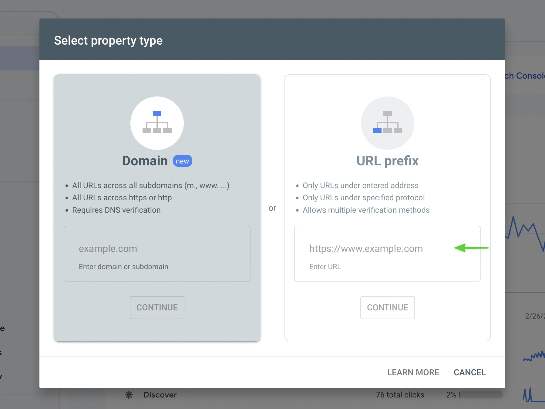 Using the URL prefix option is the easiest way to implement Google Search Console via your Ghost site and takes just a few minutes to setup. Enter your publications URL in the URL prefix box and click Continue.