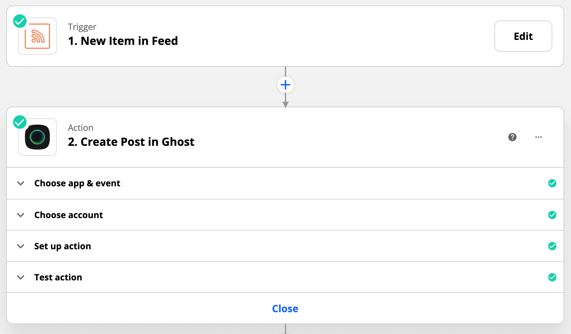 It’s also possible to automatically create a post in Ghost when a new episode is added to your Listen Later playlists, using Zapier. To do this, use the RSS by Zapier action step, using the RSS feed for your Listen Later playlist: