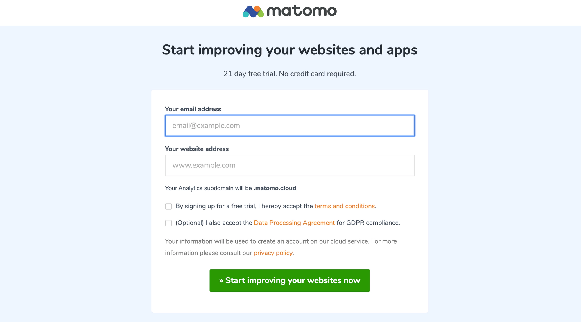 To use Matomo’s hosted offering, create an account and enter your domain to get started: