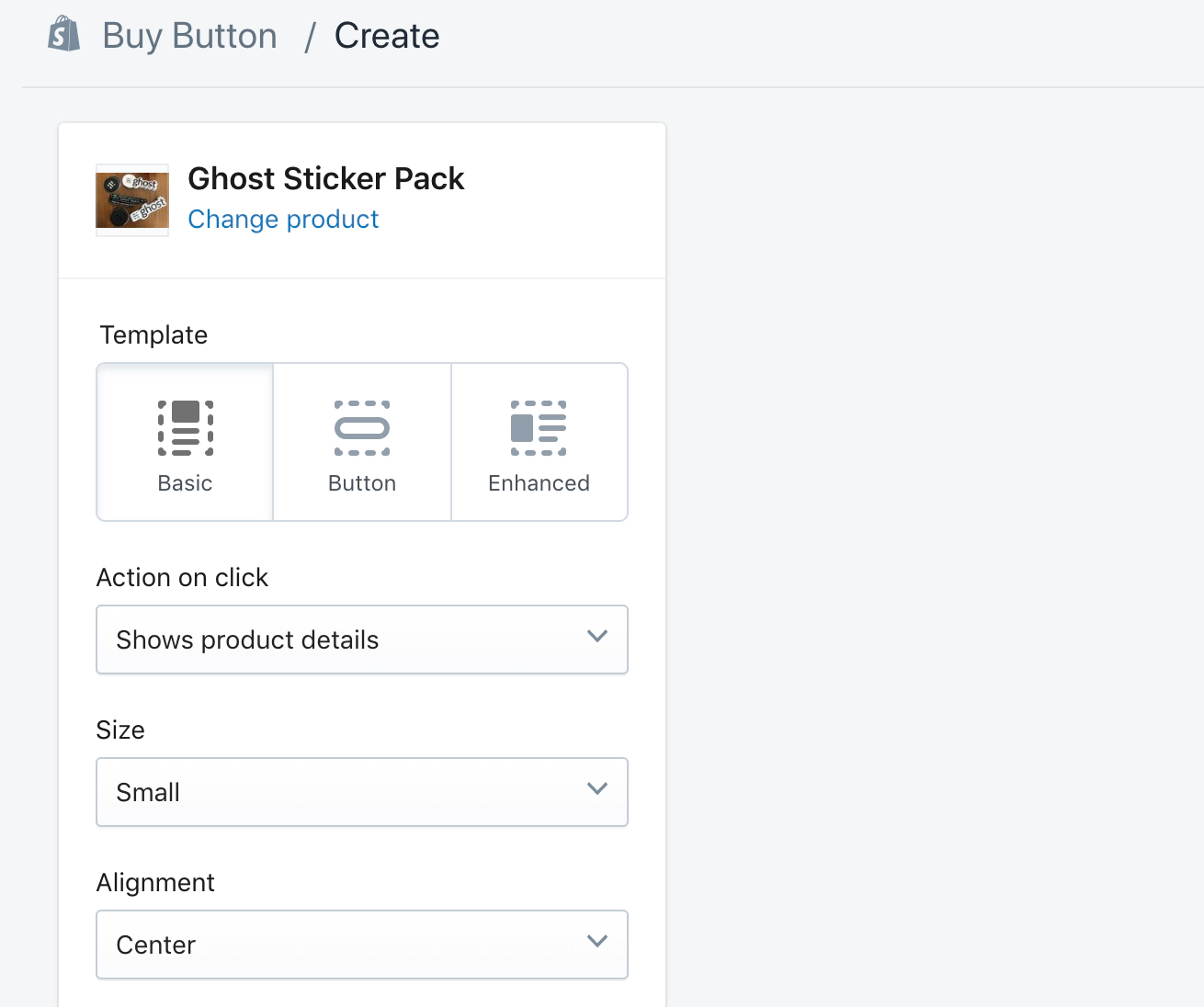 You’ll be able to select any of the products in your Shopify account to build a buy button. Once it’s created, you can adjust some of the basic functionality and design of your Buy Button.